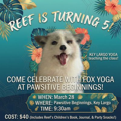 We’ll begin with a relaxing, all-levels yoga class led by Key Largo Yoga. After class, participants will have the opportunity to meet the foxes who call Pawsitive Beginnings home and celebrate Reef’s big milestone with us.